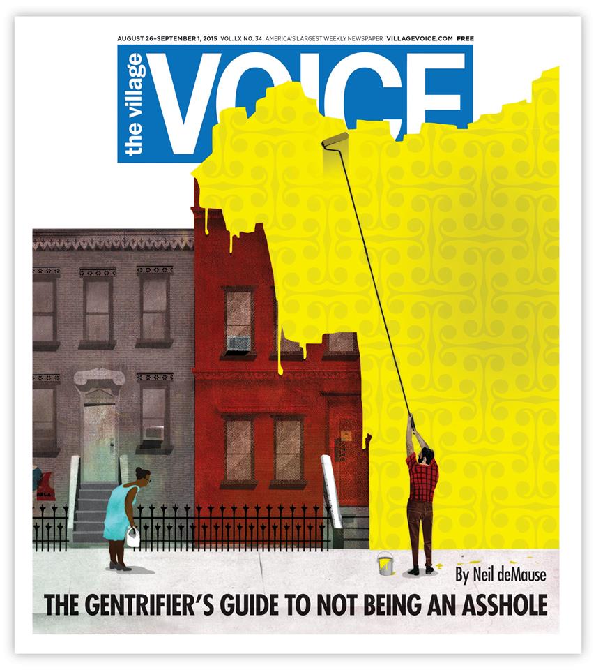 Read the “The Gentrifier’s Guide To Not Being An Asshole” on the cover of tomorrow’s Village Voice. Thanks, to the two Toms, AD: Tom Carlson and EditorTom Finkel.